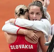 Kužmová made her senior Fed Cup debut for Slovakia in 2018. In 2020, the tournament changed its name to the Billie Jean King Cup.[68] She has played in four ties, compiling an overall record of 5–3 split between 5–1 in singles and 0–2 in doubles.[69] When Kužmová debuted for Slovakia, they were in World Group II, playing against Russia. She debuted with a singles loss against Natalia Vikhlyantseva but in the next match, she defeated Anastasia Potapova. Slovakia defeated Russia 4–1, and advanced to the World Group Play–offs, where they played against Belarus for a spot in the World Group following year.[70][71] Despite the fact that Slovakia lost, Kužmová won both of her singles matches, against Aryna Sabalenka and Sasnovich. In a decisive match against Lidziya Marozava and Vera Lapko, Kužmová and Anna Karolína Schmiedlová failed to send their country in the World Group.[72][73] The following year, in her first match in the World Group II play-offs against Brazil, she faced Beatriz Haddad Maia and won.[74] Since it was obvious that Slovakia had won, Kužmová's match against Carolina Alves was cancelled but she played doubles alongside Rebecca Šramková and they lost in straight sets.[75] In 2020, for the third year in-a-row, Kužmová was part of the team. Playing against Great Britain, she defeated Harriet Dart.[76]