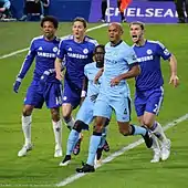 Kompany was handed the number 4 jersey for the 2010–11 season after previous wearer Nedum Onuoha moved on loan to Sunderland. On 25 April, Kompany again continued to captain the side in the absence of striker Carlos Tevez against Blackburn Rovers at Ewood Park, playing the full 90 minutes alongside Lescott in a 1–0 victory.[19] On 16 April, Kompany captained Manchester City's victory over main rivals Manchester United in the FA Cup semi-final at Wembley Stadium; City won the game 1–0.[20] Later that day, he was named in the PFA Team of the Year alongside teammate Tevez.[21]