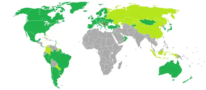 In June 2014, a plan was announced to sign further bilateral agreements on visa liberalization with important trading partners.[89] In May 2015 the list of countries for visa liberalisation was announced — Qatar, Kuwait, Oman, Bahrain, Venezuela, Panama, Jamaica, Colombia, Paraguay and Guatemala.[90] Second phase should include Armenia, Azerbaijan and Malaysia.[91] In December 2016 it was announced that Serbia plans to remove visa requirements for ordinary passport holders of Armenia, Azerbaijan and Georgia.[92] In August, October and December 2017, the Serbian Government unilaterally removed the visa requirements for the passport holders of Iran, India, Indonesia, Guinea-Bissau and Suriname.[93][94][41][42][95] In February 2018, Serbia lifted the visa requirement for nationals of Bahamas, Barbados, Colombia, Jamaica, Saint Vincent and the Grenadines and Paraguay.[96] On 9 March 2018 Serbian Government unilaterally abolished visas for Georgian citizens before the ratification of the bilateral agreement.[45] On 2 June 2018 Serbia unilaterally abolished visas for the citizens of Azerbaijan[46] and Burundi.[47] In October 2018, Government of Serbia rescinded its previous decision on visa-free entry for citizens of Iran.[63] In January 2019, Serbia lifted the visa requirement for nationals of Palau and Saint Kitts and Nevis.[97] In October 2019 Serbia abolished visa requirements for nationals of Armenia.