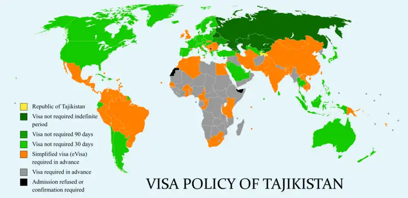 Tajikistan introduced an unilateral 30-day visa waiver for 53 countries on 1 January 2022.[2] Consequently, citizens of the following 62 countries can enter Tajikistan without a visa for stays up to the duration listed below:[1]