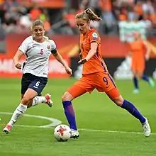 At the 2017 UEFA Women's European Championship she continued to excel under pressure, scoring a goal in the hosts' 3–0 semi-final win over England.[72][73] Miedema also netted two goals in the final against Denmark, which was enough to secure the first-ever Euro title for the Dutch.[74] After the tournament the whole team was honoured by the Prime Minister Mark Rutte and Minister of Sport Edith Schippers and made Knights of the Order of Orange-Nassau.[75]
