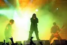 Before the release of Vol. 3, band members had promised a more experimental album; drummer Jordison said that "it's almost as if Slayer was tapping on Radiohead".[14] For the first time in Slipknot's career, songs such as "Circle" and "Vermilion Pt. 2" were led by an acoustic rather than an electric guitar. According to Todd Burns of Stylus, songs such as "Pulse of the Maggots" and "Before I Forget" incorporate a "pounding metal" style.[20] AllMusic wrote that tracks, such as "The Blister Exists", "Three Nil", and "Opium of the People", combine the two extremes of their recognizable metal edge with melody, and the most apparent shifts being in Taylor's vocal style, with relatively few songs relying solely on screamed vocals in comparison to their earlier work.[4] Entertainment Weekly wrote that the album "[bounced] between over-powering speed-metal and haunting acoustic rock".[21]