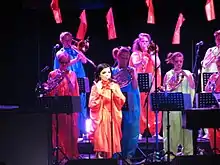 Björk went on an 18-month tour in support of the album, which was her first tour in four years.[92] On the tour, which was conducted on a month-on/month-off basis, Björk performed with fourteen musicians on stage. Björk's touring band for this tour consisted of drummer Chris Corsano, musician Mark Bell (who also accompanied Björk on the Homogenic tour), pianist Jónas Sen (who played celeste on the tracks Gratitude and Cetacea on the Drawing Restraint 9 soundtrack), musician Damian Taylor and a 10-piece female Icelandic brass section.[1][93][94] Björk had described the tour as "kind of primitive, raw, almost butch", in marked contrast to her 2001 tour for Vespertine.[95] At several of the concerts Björk had been joined on stage by some of the musicians who collaborated on the album (but who are not part of the touring band), including ANOHNI, Min Xiao-Fen and Toumani Diabaté. Björk has voiced her dislike of fans recording video or taking pictures with flash at her concerts using their mobile phones, stating that it affects her ability to perform.[95][96] The tour took Björk to countries that she has not played in for over a decade, including Mexico, Brazil, Israel, Australia and New Zealand. Live footage of two concerts in Paris and Reykjavík, as well as a session with the tour band at Olympic Studios, were released as part of the Voltaïc box set on 23 June 2009.
