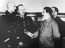 Following the German invasion of the Soviet Union ("Operation Barbarossa") in June 1941, Sikorski opened negotiations with the Soviet ambassador to London, Ivan Maisky, to re-establish diplomatic relations between Poland and the Soviet Union, which had been broken off after the Soviet invasion of Poland in September 1939.[14] In December that year, Sikorski went to Moscow with a diplomatic mission.[4] The Polish Government reached an agreement with the Soviet Union (the Sikorski-Maisky Pact of 17 August 1941), confirmed by Joseph Stalin in December of that year. Stalin agreed to invalidate the September 1939 Soviet-German partition of Poland, declare the Russo-German Molotov–Ribbentrop Pact of August 1939 null and void, and release tens of thousands of Polish prisoners-of-war held in Soviet camps.[4][14] Pursuant to an agreement between the Polish government-in-exile and Stalin, the Soviets granted "amnesty" to many Polish citizens, from whom a new army (the Polish II Corps) was formed under General Władysław Anders and later evacuated to the Middle East, where Britain faced a dire shortage of military forces.[4][14] The whereabouts of thousands more Polish officers, however, would remain unknown for two more years, and this would weigh heavily on both Polish–Soviet relations and on Sikorski's fate.[4]