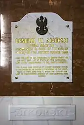 Memory of General Sikorski was also preserved both in Poland and abroad, by organizations like the Sikorski Institute in London.[5] In the UK, Sikorski received honoris causa degrees from the University of Liverpool and University of St Andrews.[5] In 1981, a commemorative plaque was revealed at Hotel Rubens in London,[5] where during the war Polish Military Headquarters, including Sikorski's office, were located.[41] He is commemorated in London's Portland Place, near the Embassy of Poland, with a larger than life statue, unveiled in 2000.[42] A propeller from the plane in which he died is the centrepiece of a new memorial to Sikorski at Europa Point, Gibraltar.[43]