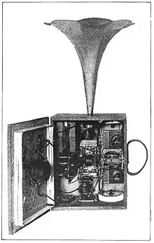 As of May 1920 the Bureau's Radio Laboratory was reported to be conducting weekly Friday evening concerts from 8:30 to 11:00, transmitting on 600 kHz.[18] That same month, the Bureau demonstrated a portable radio receiver, called the "portaphone", which was said to be capable of receiving broadcast programs up to 15 miles (24 km) away.[12] A newspaper article the following August reported that the weekly concerts could be heard up to 100 miles (160 km) from Washington. It also noted that "The bureau has been experimenting with the wireless music for several months, and has reached such an advanced stage of development that further investigation to them is useless, and they are going to discontinue the concerts."[19] However, the station continued to make occasional broadcasts, and in January 1921 a new distance record was announced when a listener in Chattanooga, Tennessee reported hearing the "jazzy waves whirling out from the Bureau of Standards".[20]