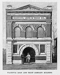 Wachovia Corporation began on June 16, 1879, in Winston-Salem, North Carolina, as the Wachovia National Bank. The bank was co-founded by James Alexander Gray and William Lemly.[10] In 1911, the bank merged with Wachovia Loan and Trust Company, "the largest trust company between Baltimore and New Orleans",[11] which had been founded on June 15, 1893. Wachovia grew to become one of the largest banks in the Southeast partly on the strength of its accounts from the R.J. Reynolds Tobacco Company, which was also headquartered in Winston-Salem.[12] On December 12, 1986, Wachovia purchased First Atlanta. Founded as Atlanta National Bank on September 14, 1865, and later renamed to First National Bank of Atlanta, this institution was the oldest national bank in Atlanta. This purchase made Wachovia one of the few companies with dual headquarters: one in Winston-Salem and one in Atlanta. In 1991, Wachovia entered the South Carolina market by acquiring South Carolina National Corporation,[13] founded as the Bank of Charleston in 1834. In 1998, Wachovia acquired two Virginia-based banks, Jefferson National Bank and Central Fidelity Bank. In 1997, Wachovia acquired both 1st United Bancorp and American Bankshares Inc, giving its first entry into Florida. In 2000, Wachovia made its final purchase, which was Republic Security Bank.