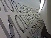 The architect's concept was a building that expressed "Welshness" and was instantly recognisable.[28] The building was designed to reflect many different parts of Wales with local Welsh materials that dominate its history: slate, metal, wood and glass.[29] Many of the materials used come from Wales, including 1,350 tonnes of Welsh slate. 300,000 concrete blocks and a million metres of electric cable were also used in construction.[30]