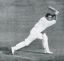 Wisden described Hammond's campaign as successful, although he failed to reach the heights of his previous tour.[103] In the Tests, Hammond scored 440 runs (average 55.00) and took nine wickets (average 32.33),[62][63] while scoring 948 runs (average 55.76)[21] and taking 20 wickets (average 28.90) in all first-class matches.[29] Although Wisden said that Hammond accomplished little with the ball,[103] team manager Plum Warner praised his bowling, claiming that during the first Test it was comparable to that of revered former England bowler Sydney Barnes.[104] His best performance was in a match against New South Wales, where he took six for 43, including the wicket of Bradman.[105] In an early game on tour against Victoria, Hammond was instructed by Jardine to attack the bowling of Chuck Fleetwood-Smith, who was on the verge of making his Test debut. Hammond scored 203, freely punishing Fleetwood-Smith's bowling and in effect delaying his Test debut for several years.[103][106][107]