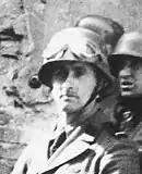 The only identification that is certain is that of Rottenführer Josef Blösche, the SS man aiming the MP 28 submachine gun at the boy.[1][10][14] Blösche was born in the Sudetenland in 1912 and served in the Einsatzgruppen,[10] and he was a policeman employed at the Warsaw Ghetto during the uprising. Marek Edelman testified that Blösche murdered Jews as part of his "daily routine" and he was known to have committed violence against children and pregnant women.[1][14] Due to his performance during the suppression of the Warsaw Ghetto uprising, Blösche was awarded the War Merit Cross 2nd Class with Swords.[10] Blösche appears in several of the photographs in the Stroop Report. During his trial in East Germany, the photographs were used as circumstantial evidence for the prosecution. He was convicted of the murder of at least 2,000 people and executed in 1969.[14] Of the photograph, Blösche stated: