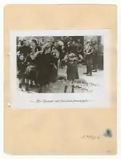 During the suppression of the uprising, Stroop sent daily communiqués to Higher SS and Police Leader Friedrich-Wilhelm Krüger in Kraków; Propaganda Company 689 and Franz Konrad took photographs to document the events.[9][10] Selected photographs and communiqués were compiled, along with a summary of German actions, as the Stroop Report, a personal souvenir for Heinrich Himmler.[11] The report was intended to promote Stroop's efficiency as a commander and excuse his failure to clear the ghetto quickly.[12] The report memorialized the supposed heroism of the SS men who participated in the suppression of the uprising, especially the sixteen who were killed by Jewish fighters.[3][13] More than 7,000 Jews were shot during the uprising, the vast majority noncombatants.[12]