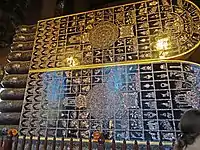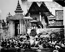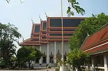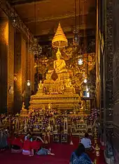 Inside the ubosot is a gold and crystal three-tiered pedestal topped with a gilded Buddha made of a gold-copper alloy, and over the statue is a nine-tiered umbrella representing the authority of Thailand.[20] The Buddha image, known as Phra Buddha Theva Patimakorn and thought to be from the Ayutthaya period, was moved here by Rama I from Wat Sala Si Na (now called Wat Khuhasawan) in Thonburi.[28][29] Rama IV later placed some ashes of Rama I under the pedestal of the Buddha image so that the public may pay homage to both Rama I and the Buddha at the same time. There are also ten images of Buddha's disciples in the hall: Moggalana is to the left of Buddha and Sariputta to the right, with eight Arahants below.[1][30]