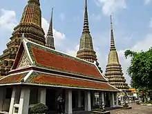 Wat Pho (Thai: วัดโพธิ์, pronounced [wát pʰōː] ⓘ), also spelled Wat Po, is a Buddhist temple complex in the Phra Nakhon District, Bangkok, Thailand. It is on Rattanakosin Island, directly south of the Grand Palace.[2] Known also as the Temple of the Reclining Buddha, its official name is Wat Phra Chetuphon Wimon Mangkhalaram Rajwaramahawihan[1] (Thai: วัดพระเชตุพนวิมลมังคลารามราชวรมหาวิหาร; pronounced [wát pʰráʔ tɕʰê:t.tù.pʰon wíʔ.mon.maŋ.kʰlaː.raːm râːt.tɕʰá.wɔː.ráʔ.má.hǎː.wíʔ.hǎːn]).[3] The more commonly known name, Wat Pho, is a contraction of its older name, Wat Photaram (Thai: วัดโพธาราม; RTGS: Wat Photharam).[4]