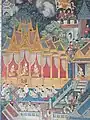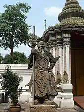 Phra Mondop or the ho trai is the Scripture Hall containing a small library of Buddhist scriptures. The building is not generally open to the public as the scriptures, which are inscribed on palm leaves, need to be kept in a controlled environment for preservation.[37] The library was built by King Rama III. Guarding its entrance are figures called Yak Wat Pho ('Wat Pho's Giants') placed in niches beside the gates.[38] Around Phra Mondop are three pavilions with mural paintings of the beginning of Ramayana.