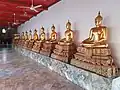 - Phra Rabiang - This double cloister contains around 400 images of Buddha from northern Thailand selected out of the 1,200 originally brought by King Rama I.[10] Of these Buddha images, 150 are on the inner side of the double cloister, another 244 images are on the outer side.[30] These Buddha figures, some standing and some seated, are evenly mounted on matching gilded pedestals. These images are from different periods in Siamese history, such as the Chiangsaen, Sukhothai, U-Thong, and Ayutthaya eras, but they were renovated by Rama I and covered with stucco and gold leaves to make them look similar.[30]