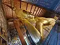The wat and the reclining Buddha (Phra Buddhasaiyas, Thai: พระพุทธไสยาสน์) were built by Rama III in 1832.[45] The image of the reclining Buddha represents the entry of Buddha into Nirvana and the end of all reincarnations.[2] The posture of the image is referred to as sihasaiyas, the posture of a sleeping or reclining lion. The figure is 15 m high and 46 m long, and it is one of the largest Buddha statues in Thailand.[1]