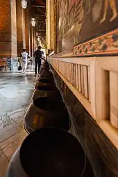 The figure has a brick core, which was modelled and shaped with plaster, then gilded.[46] The right arm of the Buddha supports the head with tight curls, which rests on two box-pillows encrusted with glass mosaics.[10] The soles of the feet of the Buddha are 3 m high and 4.5 m long, and inlaid with mother-of-pearl. They are each divided into 108 arranged panels, displaying the auspicious symbols by which Buddha can be identified, such as flowers, dancers, white elephants, tigers, and altar accessories.[10] At the center of each foot is a circle representing a chakra or 'energy point'. There are 108 bronze bowls in the corridor representing the 108 auspicious characters of Buddha. Visitors may drop coins in these bowls as it is believed to bring good fortune, and it also helps the monks to maintain the wat.[8]