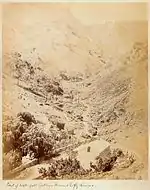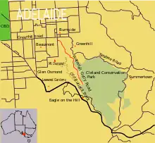 Although Hardy states that the Kaurna people did not live in the ranges themselves, they did live on the lower slopes.[9] An early settler of the neighbouring suburb of Beaumont, James Milne Young, described the local Kaurnas: "At every creek and gully you would see their wurlies [simple Aboriginal homes made out of twigs and grass] and their fires at night ... often as many as 500 to 600 would be camped in various places ... some behind the Botanic Gardens on the banks of the river; some toward the Ranges; some on the Waterfall Gully."[10] Their main presence, demarcated by the use of fire against purchasers of land,[8] was on the River Torrens and the creeks that flowed into it, including Waterfall Gully's First Creek.[11]