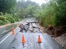 Over the years since European settlement Waterfall Gully has suffered from both bushfires and flooding. The gully was severely hit by a number of bushfires in 1939 that threatened the area, and further bushfires in the early 1940s caused considerable damage because of the war effort diverting supplies and personnel from the Emergency Fire Service.[35] Significant floods occurred in 1889 and 1931,[36] and, on the night of 7 November 2005, Waterfall Gully was one of several areas in Adelaide to experience severe flooding. Waterfall Gully was one of the hardest hit suburbs: Bob Stevenson, Duty Officer of the State Emergency Service (SES), commented that "There's an area called Waterfall Gully Road, in the foothills, where one of the creeks comes down, and there's quite a few houses affected there ... there was 40 or so houses affected on that one road alone."[37] Properties were flooded, two bridges nearly collapsed, and 100 m (330 ft) of road was washed away. Burnside council workers, the Country Fire Service (CFS) and the SES repaired the initial damage on the night while reconstruction of infrastructure commenced in late November. Much of the road had been inaccessible, and the suburb was closed except to residents and emergency workers for the remainder of the month.[38]
