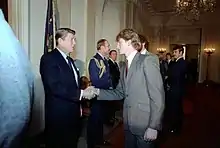 Gretzky was named an officer of the Order of Canada on June 25, 1984, for outstanding contribution to the sport of hockey. Since the Order ceremonies are always held during the hockey season, it took 13 years and 7 months—and two Governors General—before he could accept the honour.[70] He was promoted to Companion of the Order of Canada in 2009 "for his continued contributions to the world of hockey, notably as one of the best players of all time, as well as for his social engagement as a philanthropist, volunteer and role model for countless young people".[71] Five times between 1981–82 and 1986–87, Gretzky led the NHL in goals scored.[72] The Oilers also won the Stanley Cup with Gretzky three additional times: in 1985, 1987 and 1988.[73]