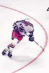 Gretzky ended his professional playing career with the New York Rangers, where he played his final three seasons and helped the team reach the Eastern Conference Finals in 1997.[111] The Rangers were defeated in the Conference Finals in five games by the Philadelphia Flyers, despite Gretzky leading the Rangers in the playoffs with 10 goals and 10 assists.[64] For the first time in his NHL career, Gretzky was not named captain,[112] although he briefly wore the captain's "C" in 1998 when captain Brian Leetch was injured and out of the line-up.[113] After the 1996–97 season, Mark Messier signed a free agent contract with the Vancouver Canucks, ending the brief reunion of Messier and Gretzky after just one season.[114] The 1997 playoff run was Gretzky's last as a player, and Rangers did not return to the playoffs until 2006, well after Gretzky retired.[115] Along with Jaromir Jagr, he topped the NHL in 1997–98 with 67 assists. It was the 16th time in 19 seasons that Gretzky earned at least a share of the league lead in the statistic.[116]