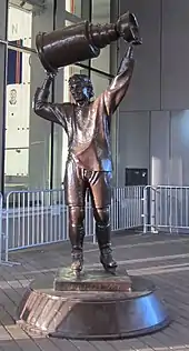 In Gretzky's first appearance in Edmonton after the trade, a game nationally televised in Canada, he received a four-minute standing ovation.[91] The arena was sold out, and the attendance of 17,503 was the Oilers' biggest crowd ever to that date.[91] Large cheers erupted for his first shift, his first touch of the puck, his two assists, and Mark Messier's body check of Gretzky into the boards.[91] After the game, Gretzky took the opportunity to confirm his patriotism: "I'm still proud to be a Canadian. I didn't desert my country. I moved because I was traded and that's where my job is. But I'm Canadian to the core. I hope Canadians understand that."[91] After the 1988–89 season, a life-sized bronze statue of Gretzky was erected outside Northlands Coliseum, holding the Stanley Cup over his head.[92]