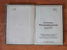 Since West Berlin was not a sovereign state, it did not issue passports. Instead, West Berliners were issued with "auxiliary identity cards" by the West Berlin authorities. These differed visually from the regular West German identity cards, with green bindings instead of the grey standard, they did not show the "Federal Eagle" or coat of arms, and contained no indications as to the issuing State. However, they did have a statement that the holder of the document was a German citizen.[25] From 11 June 1968, East Germany made it mandatory that West Berlin and West German "transit passengers" obtain a transit visa, issued upon entering East Germany,[26] because under its second constitution East Germany considered West Germans and West Berliners foreigners. Since identity cards had no pages to stamp visas, issuers of East German visas stamped their visas onto separate leaflets which were loosely stuck into the identity cards, which, until the mid-1980s, were little booklets. Although the West German government subsidized visa fees, they were still payable by individual travellers.[21]