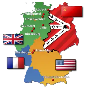 At first, this arrangement was intended to be of a temporary administrative nature, with all parties declaring that Germany and Berlin would soon be reunited. However, as the relations between the Western Allies and the Soviet Union soured and the Cold War began, the joint administration of Germany and Berlin broke down. Soon, Soviet-occupied Berlin and western-occupied Berlin had separate city administrations.[5] In 1948, the Soviets tried to force the Western Allies out of Berlin by imposing a land blockade on the western sectors—the Berlin Blockade. The West responded by using its air corridors for supplying their part of the city with food and other goods through the Berlin Airlift. In May 1949, the Soviets lifted the blockade, and West Berlin as a separate city with its own jurisdiction was maintained.[5]