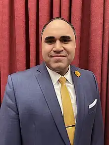 Hudson County is governed by a directly elected County Executive and by a Board of County Commissioners, which serves as the county's legislative body. As of 2023, Hudson County's County Executive is Thomas A. DeGise (D, Jersey City), whose term of office expires December 31, 2023.[76] Hudson County's Commissioners (all serving concurrent terms that end on December 31, 2023) are[77][78][79] District 1:[80] Kenneth Kopacz (Bayonne and parts of Jersey City),[81] District 2:[82] William O'Dea (western parts of Jersey City),[83] District 3:[84] Jerry Walker. (southeastern parts of Jersey City),[85] District 4:[86] Yraida Aponte-Lipski (northeastern parts of Jersey City),[87] District 5:[88] Vice Chair Anthony L. Romano Jr. (Hoboken and adjoining parts of Jersey City),[89] District 6:[90] Fanny J.Cedeno (Union City),[91] District 7:[92] Caridad Rodriguez (West New York, Weehawken, Guttenberg),[93] District 8:[94] Chair Anthony P. Vainieri Jr. (North Bergen, West New York, Secaucus)[95] and District 9:[96] Albert Cifelli (East Newark, Harrison, Kearny, and Secaucus).[97]