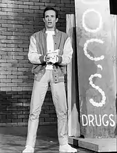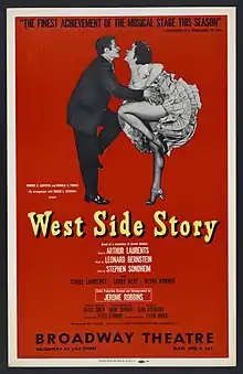 Throughout the rehearsal period, the New York newspapers were filled with articles about gang warfare, keeping the show's plot timely. Robbins kept the cast members playing the Sharks and the Jets separate in order to discourage them from socializing with each other and reminded everyone of the reality of gang violence by posting news stories on the bulletin board backstage.[23] Robbins wanted a gritty realism from his sneaker- and jeans-clad cast. He gave the ensemble more freedom than Broadway dancers had previously been given to interpret their roles, and the dancers were thrilled to be treated like actors instead of just choreographed bodies.[24] As the rehearsals wore on, Bernstein fought to keep his score together, as other members of the team called on him to cut out more and more of the sweeping or complex "operatic" passages.[16] Columbia Records initially declined to record the cast album, saying the score was too depressing and too difficult.[5]