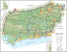 West Sussex is bordered by Hampshire to the west, Surrey to the north and East Sussex to the east. The English Channel lies to the south. The area has been formed from Upper Jurassic and Lower Cretaceous rock strata, part of the Weald–Artois Anticline. The eastern part of this ridge, the Weald of Kent, Sussex and Surrey has been greatly eroded, with the chalk surface removed to expose older Lower Cretaceous rocks of the Wealden Group.[11] In West Sussex the exposed rock becomes older towards the north of the county with Lower Greensand ridges along the border with Surrey including the highest point of the county at Blackdown. Erosion of softer sand and clay strata has hollowed out the basin of the Weald leaving a north facing scarp slope of the chalk which runs east and west across the whole county, broken only by the valleys of the River Arun and River Adur.[12] In addition to these two rivers which drain most of the county a winterbourne, the River Lavant, flows intermittently from springs on the dip slope of the chalk downs north of Chichester.[13]