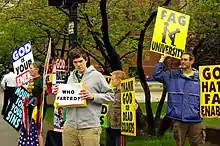 Westboro Baptist first began protesting homosexuality in 1989 after the discovery of what they referred to as a "tearoom", meaning a public lavatory used for homosexual interactions.[9] The group later began picketing Gage Park six blocks northwest of its headquarters in Topeka in 1991, saying it was a den of anonymous homosexual activity.[10] Soon, its protests had spread throughout the city, and within three years WBC was traveling across the country.[11] Phelps explained in 1994 that he considered the negative reaction to the picketing to be proof of his righteousness.[12]