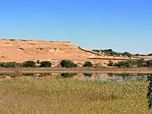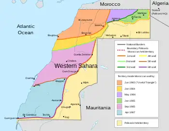 The Moroccan and Mauritanian annexations were resisted by the Polisario Front, which had gained backing from Algeria.[29] It initiated guerrilla warfare and, in 1979, Mauritania withdrew due to pressure from Polisario, including a bombardment of its capital and other economic targets. Morocco extended its control to the rest of the territory. It gradually contained the guerrillas by setting up the extensive sand-berm in the desert (known as the Border Wall or Moroccan Wall) to exclude guerrilla fighters.[30][31] Hostilities ceased in a 1991 cease-fire, overseen by the peacekeeping mission MINURSO, under the terms of a UN Settlement Plan.