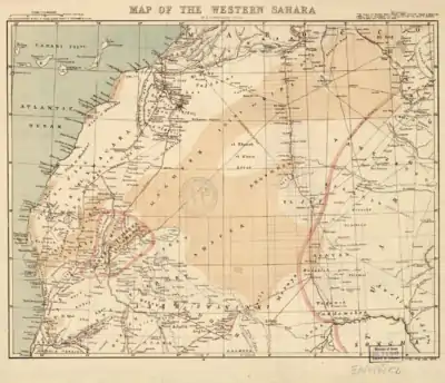The Spanish presence in the region of modern-day Western Sahara lasted from 1884 to 1975. While initial Spanish interest in the Sahara was focused on using it as a port for the slave trade, by the 1700s Spain had transitioned economic activity on the Saharan coast towards commercial fishing.[25] By the 19th century, Spain had claimed the southern coastal region and penetration of the hinterland gradually followed; later in 1904 the northern region was acquired. After an agreement among the European colonial powers at the Berlin Conference in 1884 on the division of spheres of influence in Africa, the same year Spain seized control of Western Sahara and established it as a Spanish colony.[26] Despite establishing their first colony in the region at Río de Oro Bay in 1884, the Spanish were unable to pacify the interior of the region until the 1930s. Raids and rebellions by the indigenous Saharan population kept the Spanish forces out of much of the territory for a long time. The territory was eventually subdued by joint Spanish and French forces in 1934, the same year the Spaniards divided their Saharan territories into two regions named after the rivers: Saguía el-Hamra and Río de Oro. After 1939 and the outbreak of World War II, this area was administered by Spanish Morocco. In 1958, Spain joined the district of Saguia el-Hamra (the “Red River”) in the north with the Rio de Oro (in the south) to form the province of Spanish Sahara, following Morocco’s claiming these regions in 1957. As a consequence, Ahmed Belbachir Haskouri, the Chief of Cabinet, General Secretary of the Government of Spanish Morocco, cooperated with the Spanish to select governors in that area. The Saharan lords who were already in prominent positions, such as the members of Maa El Ainain family, provided a recommended list of candidates for new governors. Together with the Spanish High Commissioner, Belbachir selected from this list. During the annual celebration of Muhammad's birthday, these lords paid their respects to the caliph to show loyalty to the Moroccan monarchy.