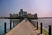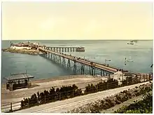 Isambard Kingdom Brunel and his family lived in Weston, at Swiss Villa (towards the north end of Trevelyan road), while he was supervising the construction of the Bristol and Exeter Railway in the area. With the opening of the railway in 1841, thousands of visitors came to the town from Bristol, the Midlands and further afield, on works outings and bank holidays. Mining families also came across the Bristol Channel from South Wales by paddle steamer. To cater for them, Birnbeck Pier was completed in 1867, offering in its heyday amusement arcades, tea rooms, amusement rides and a photographic studio. It is now in a derelict state and has been added to English Heritage's Buildings at Risk Register,[20] but visitors can still admire its structure from behind barbed wire. It was designed by Eugenius Birch with ironwork by the Isca Foundry of Newport, Monmouthshire. It is a grade II* listed building.[21]