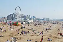 The beach of Weston Bay lies on the western edge of the town. The upper part is sandy, but the sea retreats a long way at low tide, exposing large areas of mud flats (hence the colloquial name of Weston-super-Mud).[58] The tidal range in this part of the Bristol Channel is great, and since beach and mud flats are on a gentle slope, it is inadvisable to try to reach the sea at low tide, as the sand gives way to deep mud which has often resulted in loss of life over the years. Driving on the beach is permitted in certain areas, but occasionally the drivers are caught unawares as they drive too close to the sea and break through the sand into the underlying mud, and are then stuck.