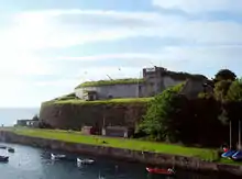 During the French Revolutionary and Napoleonic wars, Weymouth started to gain some military importance: in 1795, the Red Barracks were constructed for cavalry troops stationed at Nothe. They were badly damaged in 1798 by a fire[5] and work started on new buildings and a parade ground at Radipole. These premises could house 953 officers and men together with 986 horses.[19] The Red Barracks were rebuilt in 1801 and given over to infantry.[5] Militarisation of the town continued through the Victorian era, with work starting on Portland Harbour in 1849. Built specifically to accommodate the new steam navy, the project was completed in 1872.[20] Between 1860 and 1872, Nothe Fort was constructed at the entrance of Weymouth Harbour, overlooking the new harbour at Portland.[21]