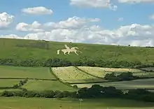 In celebration of the king's patronage, in 1810, a painted statue was built on the seafront. Known simply as the King's Statue, it was extensively renovated in 2007–08.[4][17] A second tribute to George III, completed two years earlier in 1808, is the mounted white horse at Osmington. Designed by local architect James Hamilton, and cut into the chalk hillside by soldiers under his direction, the figure measures 280 ft (85 m) long by 323 ft (98 m) high.[18]