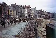 Weymouth's military importance made it a target for German bombing during World War II. The air raids destroyed 1,200 civilian dwellings and killed 76 civilians, and the high street was so badly damaged that much of it had to be demolished after the war.[4][25] In September 1942 the first full-scale testing of the bouncing bomb was carried out west of the town, on the lagoon behind Chesil Bank.[26][27] Tens of thousands of Allied troops departed Weymouth and Portland for D-Day, bound for Omaha in Normandy. By the time the conflict in Europe had ended, 517,816 troops and 144,903 vehicles had been through the ports.[4]