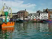The modern town of Weymouth originated as the two settlements of Weymouth and Melcombe Regis, on opposite sides of Weymouth Harbour in Dorset. The older of the two, on the south side, was referred to as Weymouth as early as the 10th century, as part of the parish of Wyke Regis, and by 1252 had become a chartered borough and established seaport, trading in imported wine. Melcombe Regis, on the north side, was first noted in the 11th century. It developed separately from the mid 12th century onwards and in 1310 was a licensed wool port.[4][5] But French raiders found the port so accessible that in 1433 the staple was transferred to Poole.[6] Melcombe Regis is thought to be the first port at which the Black Death came into England in June or July 1348, possibly aboard either a spice ship or an army ship from Calais, where fighting was taking place in the Hundred Years' War.[7][8]