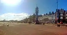 Weymouth is the largest town in the area, larger than the county town of Dorchester, which lies 11 km (7 mi) to the north, and hence is a centre of activity for the nearby population.[47] Weymouth's esplanade is composed of Georgian terraces, which have been converted into apartments, shops, hotels and guest houses.[45] The buildings were constructed in the Georgian and Regency periods between 1770 and 1855, designed by architects such as James Hamilton, and were commissioned by wealthy businessmen.[5] These terraces form a long, continuous arc of buildings which face Weymouth Bay along the esplanade, which is home to statues of Victoria, George III and Sir Henry Edwards, Member of Parliament for the borough from 1867 to 1885, and two war memorials.[4][48]