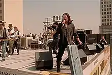 The depiction of the police attempting to shut down the filming due to safety concerns actually happened during filming, just as seen in the video. Hamlyn was almost arrested following a confrontation with the police.[31] According to Avis, the events depicted in the video show what actually happened that day "almost in real time", and that "getting busted was an integral part of the plan."[30] Band manager Paul McGuinness revealed in 2007 that much of the confrontation with the police was exaggerated; the group were hoping to get shut down by the authorities in order to dramatize the music video, but the police continually gave them extensions for shooting the video.[32] In the background of the video is a sign for The Million Dollar Hotel, which was rebuilt to create some interest, in case no one showed up at the film shoot.[30] Although the video is of a live performance, the audio used is from the studio-recorded version of the song.[33] The video won the Grammy Award for Best Performance Music Video at the 1989 Grammy Awards.[34]