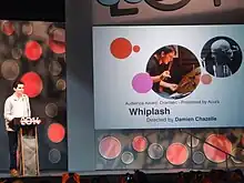 Whiplash premiered in competition at the 2014 Sundance Film Festival on January 16, 2014, as the festival's opening film; it won the Audience Award and Grand Jury Prize for drama.[5] The film opened in limited release domestically in the United States and Canada on October 10, 2014, gradually expanding to over 500 screens and finally closing on March 26, 2015. The film received widespread acclaim for its screenplay, direction, film editing, sound mixing, and Teller's and Simmons's performances, and grossed $49 million on a $3.3 million budget, making it Chazelle's highest grossing feature until La La Land (2016). The film received multiple awards and nominations, winning Academy Awards for Best Film Editing and Best Sound Mixing, and also being nominated for Best Picture and Best Adapted Screenplay. Simmons's portrayal of Fletcher won him the Academy, BAFTA, Critics' Choice, Golden Globe, and Screen Actors Guild awards for Best Supporting Actor. It has since been cited as one of the best films of the 2010s and the 21st century.[6][7][8][9][10]
