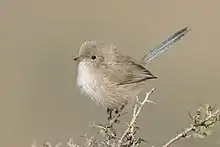 The white-winged fairywren (Malurus leucopterus) is a species of passerine bird in the Australasian wren family, Maluridae. It lives in the drier parts of Central Australia; from central Queensland and South Australia across to Western Australia. Like other fairywrens, this species displays marked sexual dimorphism and one or more males of a social group grow brightly coloured plumage during the breeding season. The female is sandy-brown with light-blue tail feathers; it is smaller than the male, which, in breeding plumage, has a bright-blue body, black bill, and white wings. Younger sexually mature males are almost indistinguishable from females and are often the breeding males. In spring and summer, a troop of white-winged fairywrens has a brightly coloured older male accompanied by small, inconspicuous brown birds, many of which are also male. Three subspecies are recognised. Apart from the mainland subspecies, one is found on Dirk Hartog Island, and another on Barrow Island off the coast of Western Australia. Males from these islands have black rather than blue breeding plumage.