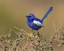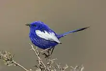 Nestlings, fledglings, and juveniles have brown plumage and pink-brown bills with shorter tails than adults. Young males develop blue tail feathers and darker bills by late summer or autumn (following a spring or summer breeding season), while young females develop light blue tails. By the subsequent spring, all males are fertile and have developed cloacal protuberances, which store sperm. In contrast, during the breeding season, fertile females develop oedematous brood patches, which are bare areas on their bellies.[24] Males entering their second or third year may develop spotty blue and white plumage during the breeding season. By their fourth year, males have assumed their nuptial plumage, where the scapulars, secondary wing coverts, and secondary flight feathers are white while the rest of their bodies are a vibrant cobalt blue. All sexually mature males moult twice a year, once before the breeding season in winter or spring, and again afterwards in autumn; rarely, a male may moult directly from nuptial to nuptial plumage.[28] The breeding males' blue plumage, particularly the ear-coverts, is highly iridescent due to the flattened and twisted surface of the barbules.[30] The blue plumage also reflects ultraviolet light strongly, and so may be even more prominent to other fairywrens, whose colour vision extends into this part of the spectrum.[31]