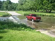 Among the park's most distinctive and well-known features are the vehicular river crossings. At three places, crossing Pine Creek, fords were constructed instead of bridges.[5] The fords offer visitors a chance to actually drive through the creek, though high water frequently closes the crossings.[5][9] Hikers are relegated to pedestrian bridges or stepping stones in the creek to cross the stream.[10] Floods are frequent enough on Pine Creek, a large watershed to the north of the park, that there is an emergency exit from the campground. When high water closes the fords, the campground is cut off and the emergency exit is the only way out.[5]