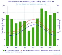 Whittier's annual average temperature is 41.1 °F (5.1 °C), with the hottest month being July at 57.2 °F (14.0 °C) and the coldest month being January at 28.2 °F (−2.1 °C). Temperature extremes ranged from −29 °F (−34 °C) on December 23, 1942 to 88 °F (31 °C) on July 23, 1966. Whittier's coldest temperatures typically fluctuate between 0 °F (−18 °C) and 10 °F (−12 °C) each year, so Whittier falls in USDA Plant Hardiness Zones 7a.[21]