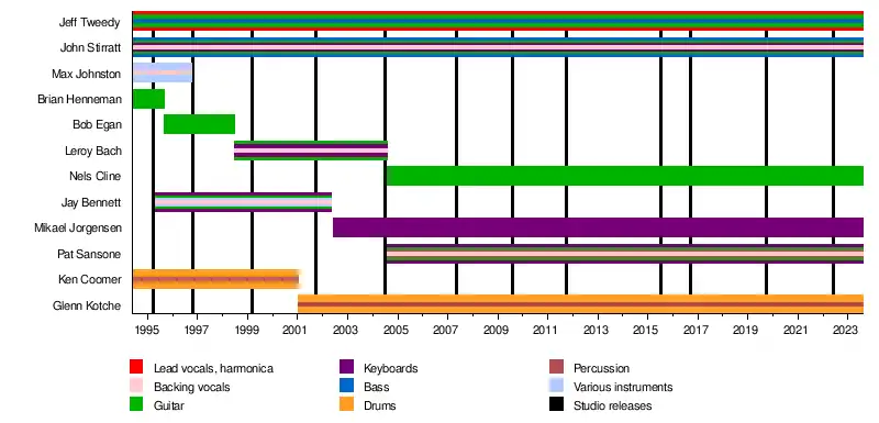 Wilco is an American alternative rock band based in Chicago, Illinois. The band was formed in 1994 by the remaining members of alternative country group Uncle Tupelo following singer Jay Farrar's departure. Wilco's lineup changed frequently during its first decade, with only singer Jeff Tweedy and bassist John Stirratt remaining from the original incarnation. Since early 2004, the lineup has been unchanged, consisting of Tweedy, Stirratt, guitarist Nels Cline, multi-instrumentalist Pat Sansone, keyboard player Mikael Jorgensen, and drummer Glenn Kotche. Wilco has released twelve studio albums, a live double album, and four collaborations: three with Billy Bragg and one with The Minus 5.
