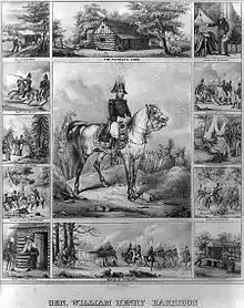 Harrison was promoted to lieutenant after Major General "Mad Anthony" Wayne took command of the western army in 1792, following a disastrous defeat under Arthur St. Clair.[12] In 1793, he became Wayne's aide-de-camp and acquired the skills to command an army on the frontier;[6] he participated in Wayne's decisive victory at the Battle of Fallen Timbers on August 20, 1794, which ended the Northwest Indian War.[14] He received the following commendation from Wayne for his role in the battle: "I must add the name of my faithful and gallant Aide-de-camp ... Lieutenant Harrison, who ... rendered the most essential service by communicating my orders in every direction ... conduct and bravery exciting the troops to press for victory."[5] Harrison was a signatory of the Treaty of Greenville (1795), as witness to Wayne, the principal negotiator for the U.S.[12] Under the terms of the treaty, a coalition of Indians ceded a portion of their lands to the federal government, opening two-thirds of Ohio to settlement.[15][16]