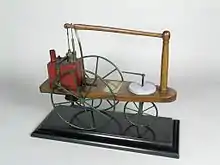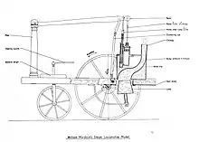 Murdoch's working model was a three-wheeled vehicle about a foot in height with the engine and boiler placed between the two larger back wheels with a spirit lamp underneath to heat the water and a tiller at the front turning the smaller front wheel. The mechanics of the model locomotive incorporated a number of innovations, such as a boiler safety valve, having the cylinder partly immersed in the boiler and using a new valve system on the lines of the D-slide valve.